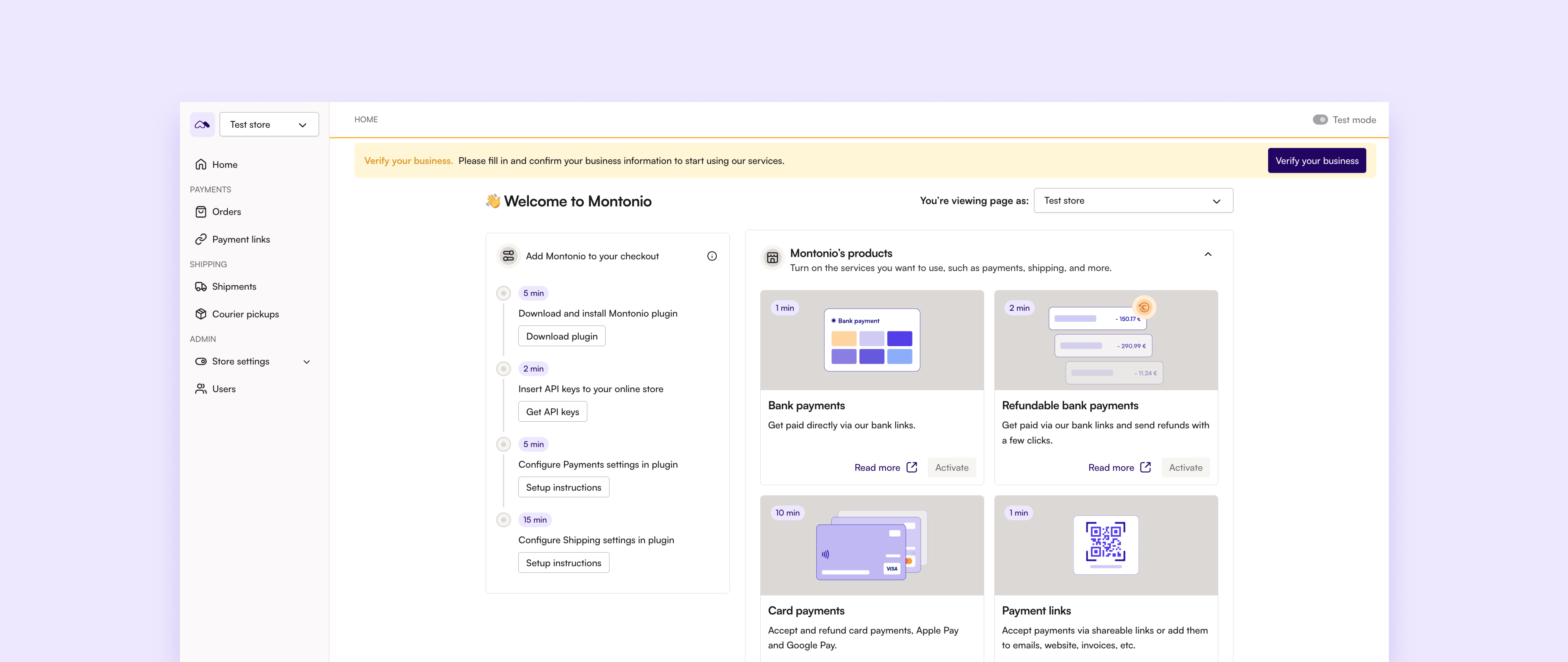Montonio needed a clearer starting point for newly signed-up merchants. The objective was to create a welcome page that highlights available services and guides merchants toward activating them right after signing up — a key step in improving overall onboarding conversion.